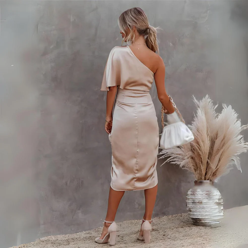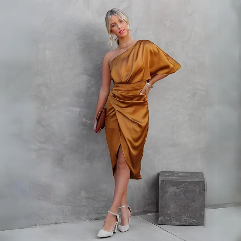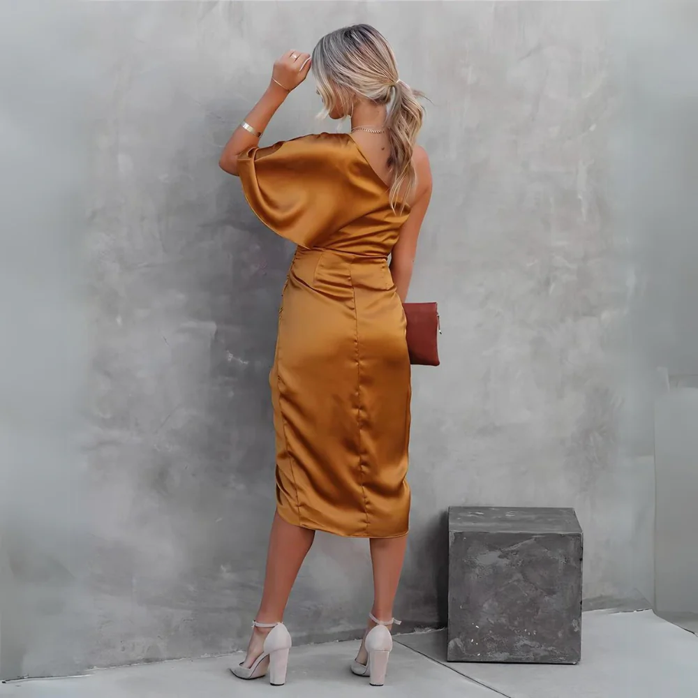 La robe à une manche pour femme est dotée d'une jupe plissée unique qui donne un insolent à vos mouvements, vous garantissant de se démarquer dans la foule. Le irrésistible col diagonal attire l'attention sur votre clavicule, tandis que la stylistique combinaison de design classique et moderne accentue votre goût pour la mode.